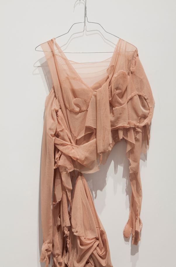 Porter ma peau est une réflexion sur la création de l’image du corps féminin par les médias et sur les conséquences de cette création culturelle sur la perception distordue que les femmes ont de leur propre corps. Le trouble de dysmorphie corporelle en est un exemple; il se caractérise par une obsession concernant un trait de son apparence physique perçu comme un défaut au point d’affecter l’expérience quotidienne. L’action de la performance-vidéo présente donc l’envie de se détacher complètement de son enveloppe corporelle, comme de l’importance qu’on accorde à son apparence. Elle consiste à recouvrir le corps de plusieurs couches de tissu, comme un épiderme, jusqu’à ce que la personne en soit complètement captive. La performance se termine lorsque ces peaux sont arrachées et l’être, libéré de leur suffocante étreinte.
