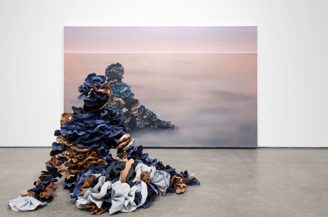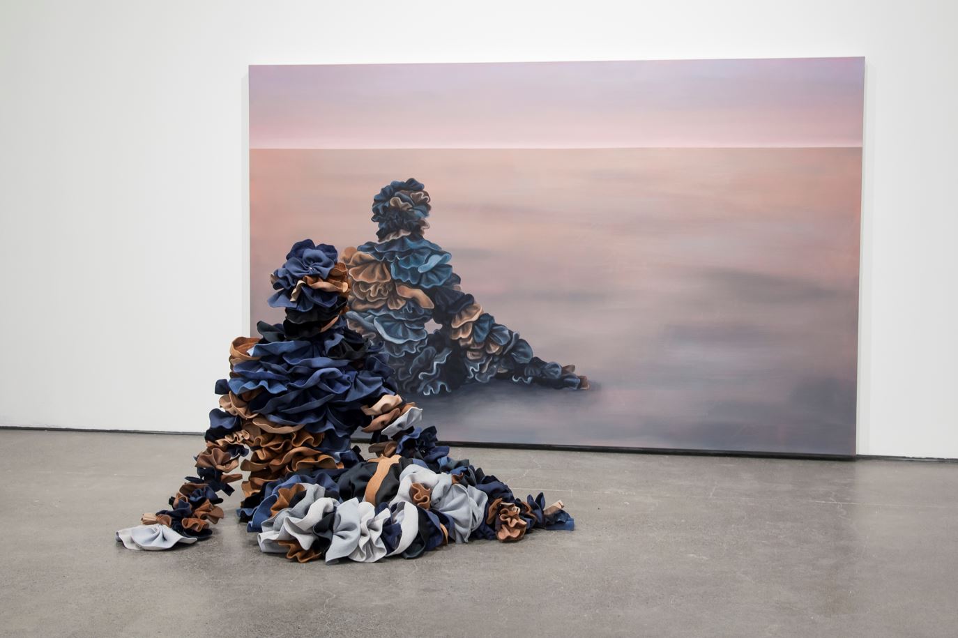 Réflexion mycorhyzienne 2022 Refente de cuir sur structure de métal et huile sur toile Sculpture : 70 x 60 x 50 cm Tableau : 127 x 200 cm